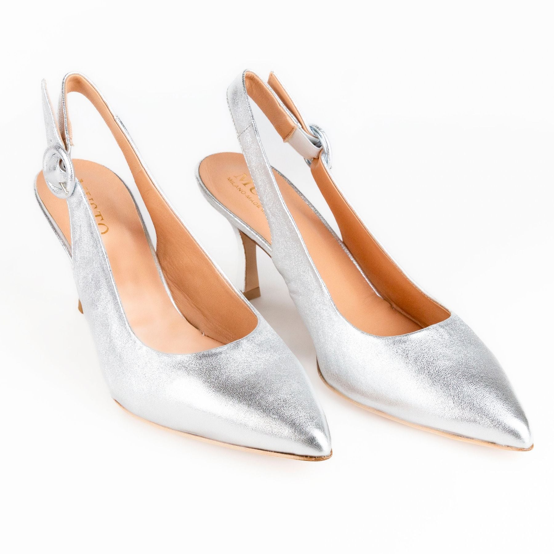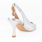 Eleva il tuo look con queste slingback in pelle laminata argento, un vero gioiello artigianale Made in Italy. La loro costruzione a "sacchetto" le rende incredibilmente flessibili e confortevoli, adattandosi perfettamente alla forma del tuo piede. Il tacco di 7,5 cm slancia la figura con eleganza, mentre il cinturino regolabile assicura una calzata personalizzata. Perfette per aggiungere un tocco di glamour a ogni outfit.