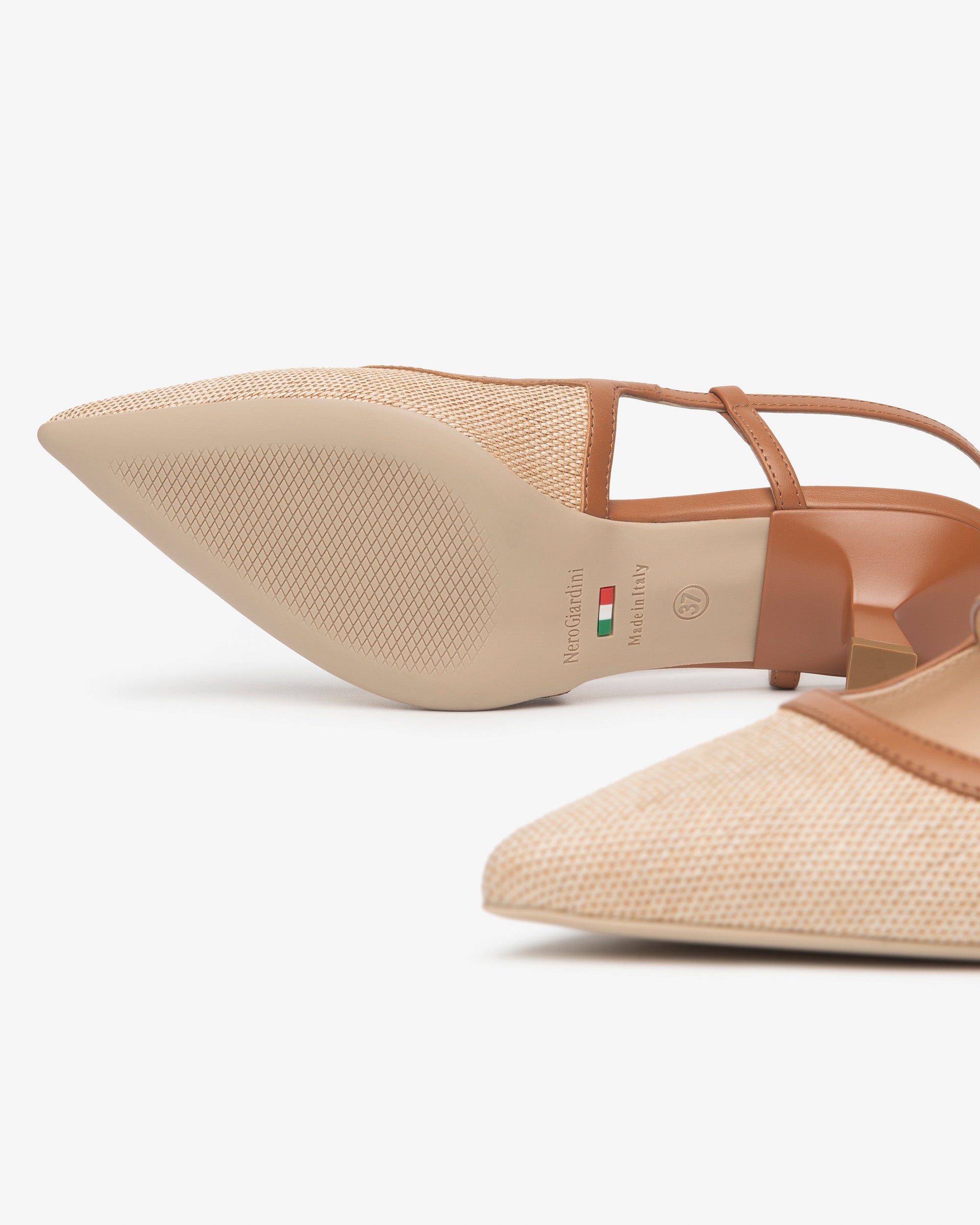 Slingback NeroGiardini in tela beige con raffinati profili in pelle marrone. Il sottopiede in pelle Memory assicura comfort e morbidezza tutto il giorno. Tacco medio 5 cm e cinturini regolabili per una calzata stabile. L'eleganza del Made in Italy per la bella stagione.